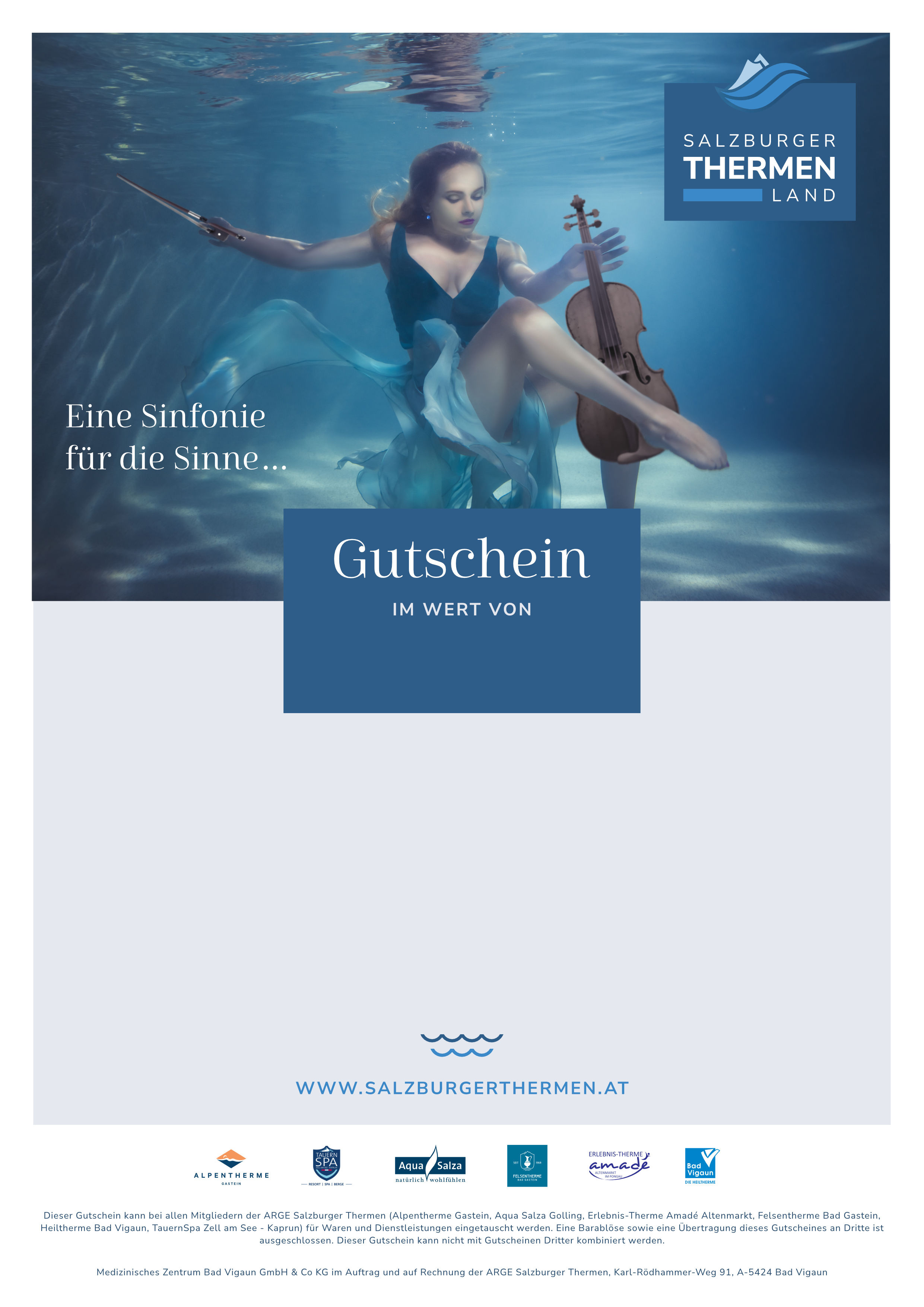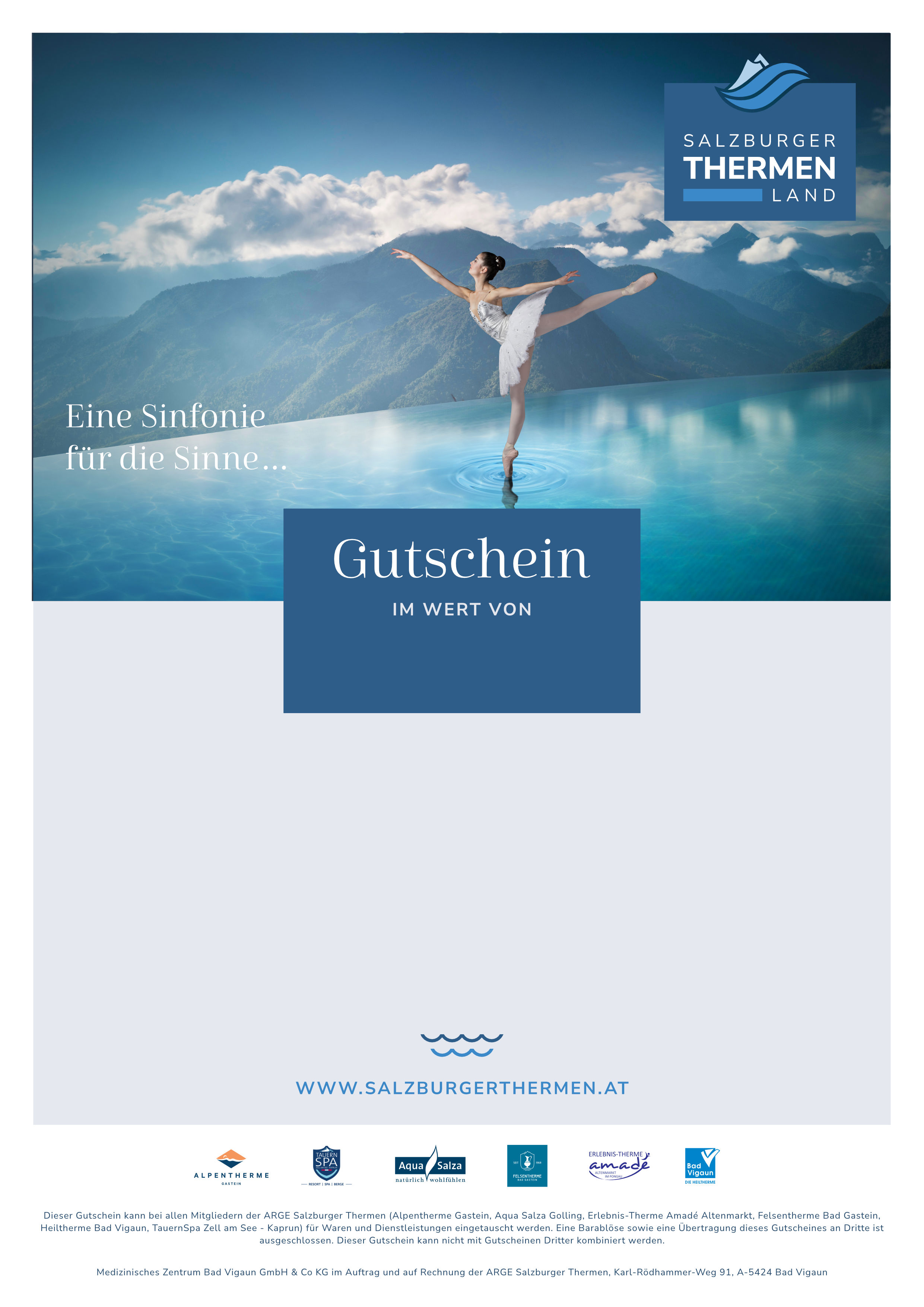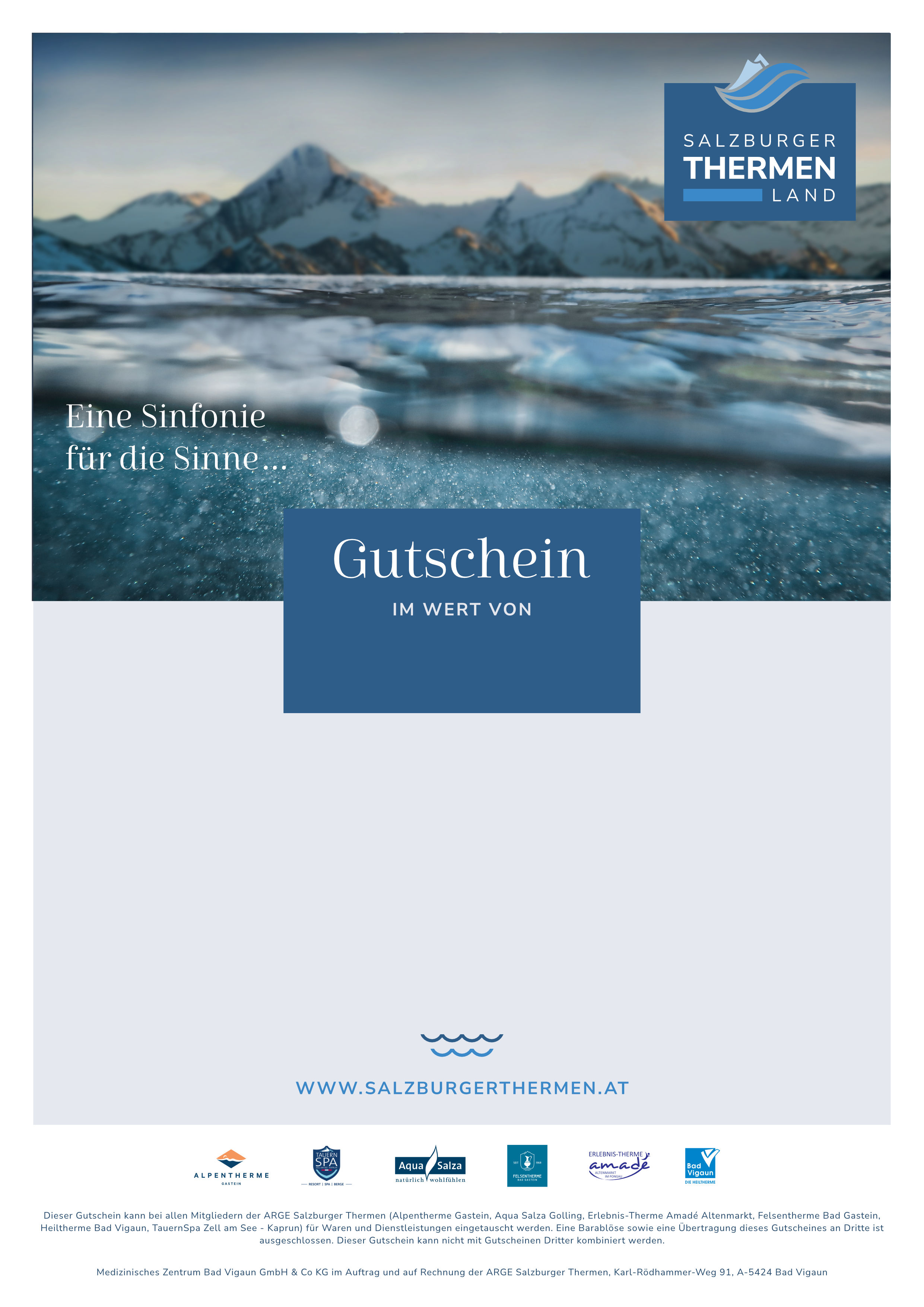 - Flexibel in allen 6 Salzburger Thermen einlösbar: Alpentherme Gastein, Aqua Salza Golling, Erlebnis-Therme Amadé, Felsentherme Bad Gastein, Heiltherme Bad Vigaun und Tauern SPA Zell am See – Kaprun